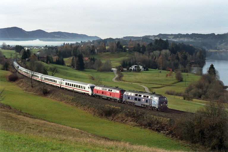 218 473 befördert zusammen mit einer weiteren Lok der Baureihe 218 bei Martinszell