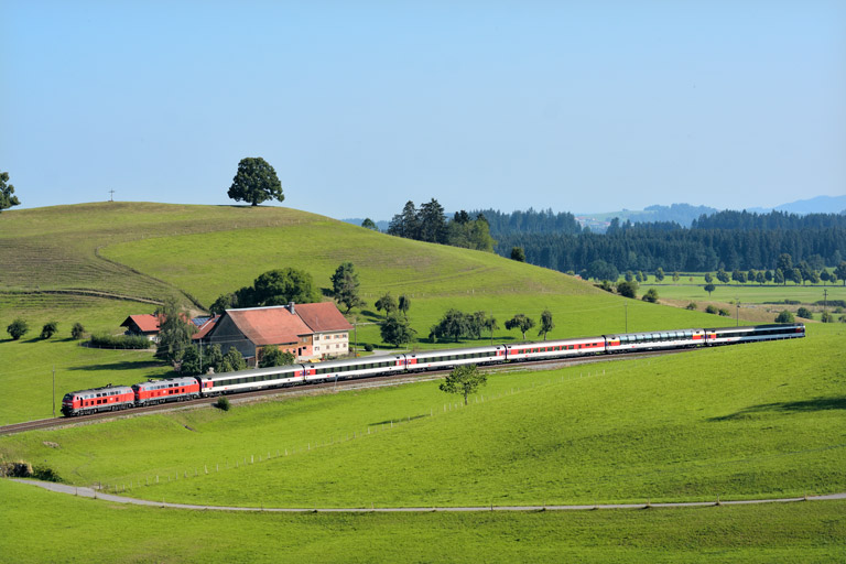 | Bei Heimhofen ist eine Doppeltraktion der Baureihe 218 mit dem umgeleiteten EC 196 |