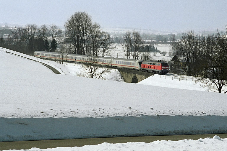 Eine Lok der Baureihe 218 ist bei Waltenhofen mit IC 2084
