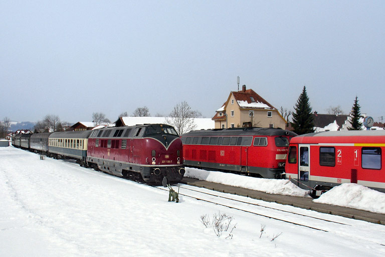 | Der von 221 135 gezogene Sonderzug DPE 85460 Immenstadt - Pfronten-Ried begegnet beim |