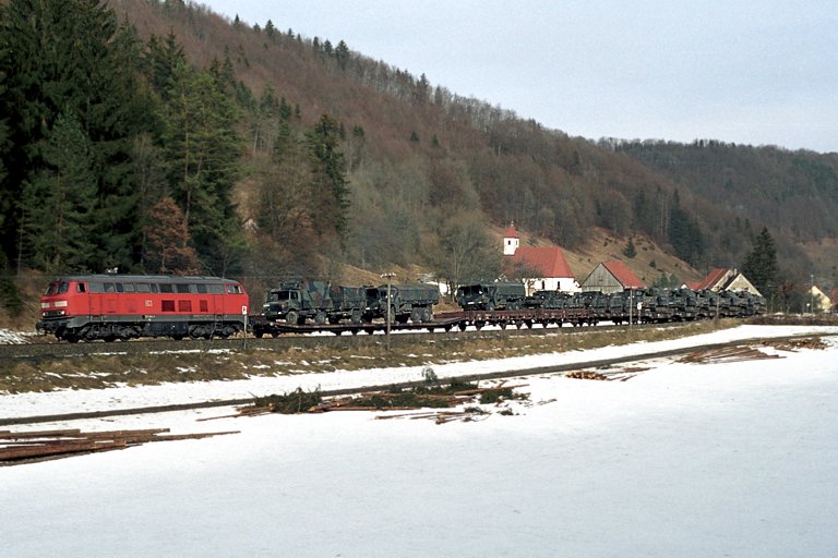 225 084 zieht einen Militärzug auf der Fahrt von Schelklingen nach